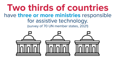 As assistive technology is a cross-cutting topic, responsibility can be shared or contested, leading to fragmented efforts and a lack of leadership. Whilst the Ministries of Health and Social Services are often the responsible ministries, the other ministries such as finance, education, labour, trade and commerce, defence and telecommunications may also have different programmes serving different population groups, meaning access is not always equitable.